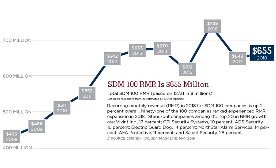 The SDM 100 has been published since 1991. Its primary objective is to measure consumer dollars gained by security companies, in order to present an account of the size of the market captured by the 100 largest providers. SDM 100 companies are ranked by their recurring monthly revenue. RMR is the revenue associated with the contractual agreement between a security company and its subscriber — derived from customer billing for services such as monitoring, contracted service/system maintenance, security-as-a-service and managed/cloud solutions, and leasing of security systems — and is typically the basis for valuation of a security company. RMR is the language of security company executives and is meaningful in comparative analysis among industry peers. Of the 100 security dealers ranked, 38 of them earned more than $1 million in RMR in 2018.
